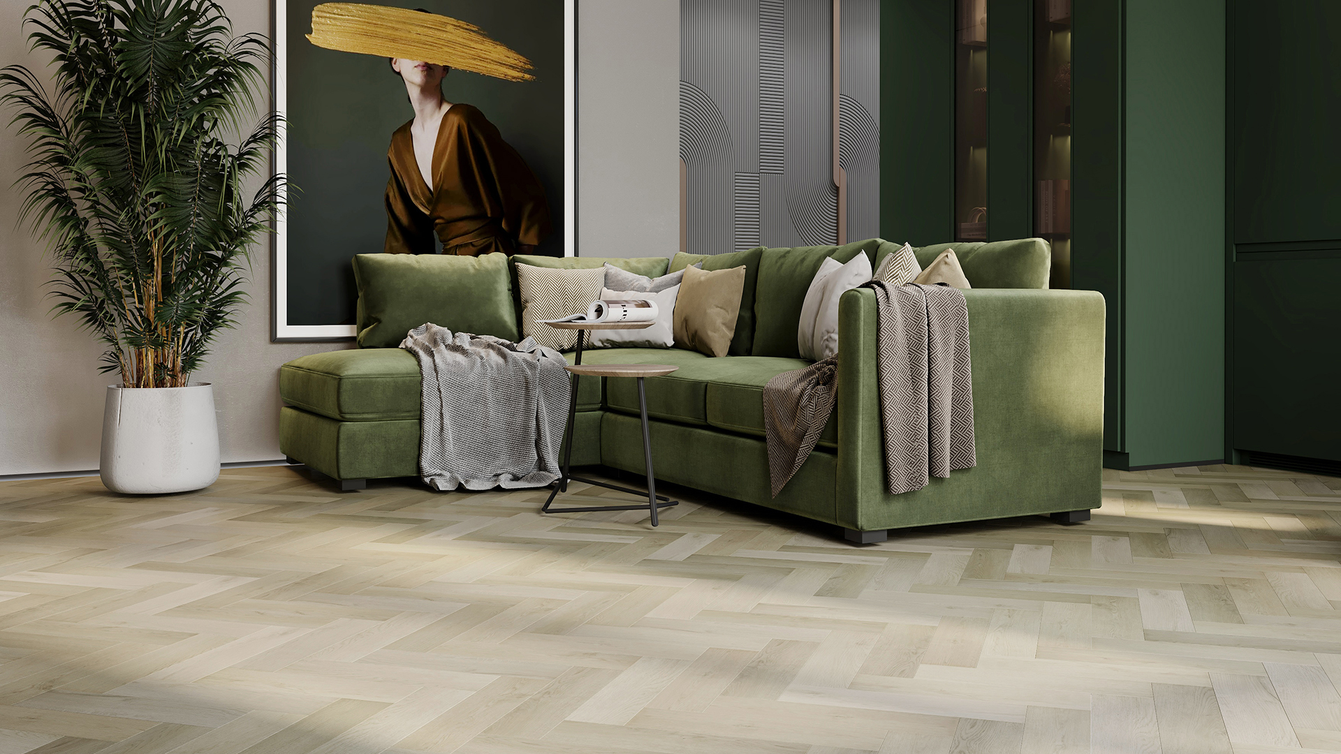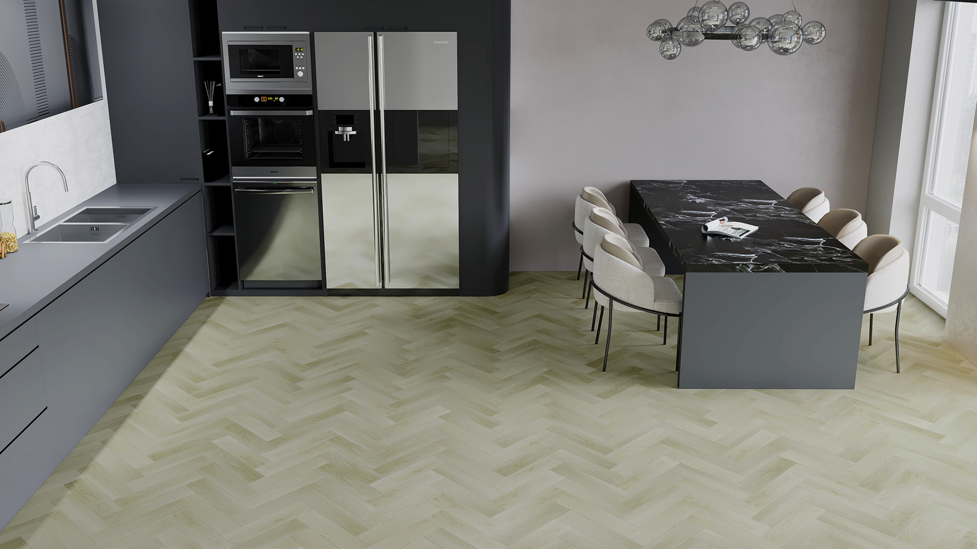 Fargo Herringbone выглядит точь-в-точь как штучный паркет с такими удивительными бонусами, как высокая прочность, водостойкость и совместимость с теплым полом. Коллекция Fargo Herringbone, как и все другие коллекции кварцевого ламината FARGO, подходит для укладки во всех комнатах, в том числе и для беспороговой укладки на большой площади (до 200 м2).