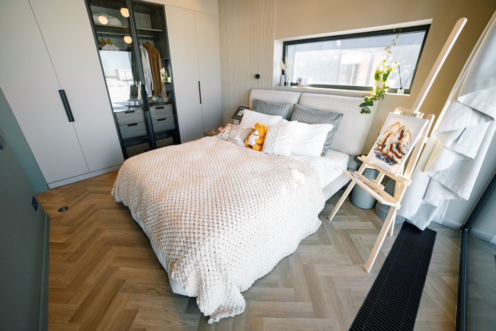 В активной зоне кварцевый ламинат уложен единым полотном, он подчёркивает целостность пространства и создает ощущение порядка. Это современный дом с качественными материалами, где комфорт чувствуется сразу — без лишних объяснений.